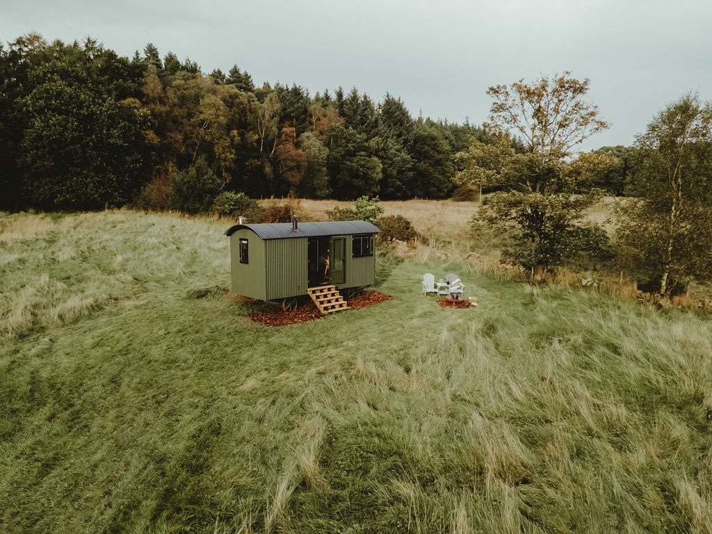 Into The Glade Cabaña de pastores en el prado y el bosque