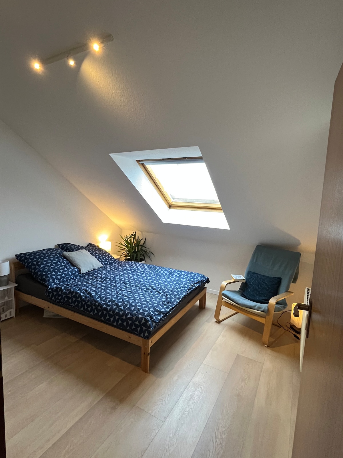 Casa adosada final con tres dormitorios. En un barrio muy tranquilo. Por lo tanto, debe respetarse el comportamiento tranquilo y el volumen de la habitación en el área al aire libre. En el primer piso hay un inodoro, cocina y salón. El baño y los tres dormitorios, cada uno con una cómoda cama doble tamaño king y TV, están en el segundo piso. La habitación izquierda da al lado sur. La habitación del medio tiene un balcón al lado oeste con sol al atardecer.