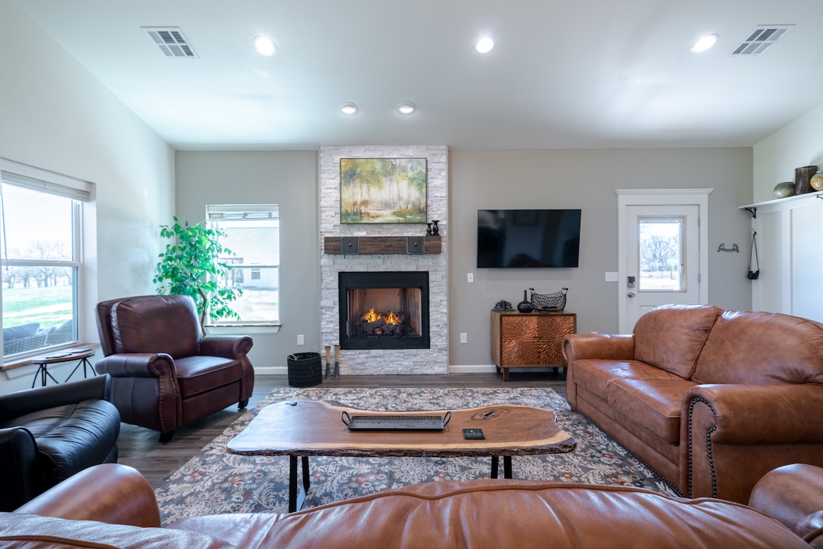 Cabaña de invitados en la cima de una colina con vistas a nuestro rancho de ganado en funcionamiento. La cabaña está actualizada, limpia y totalmente equipada con todo lo necesario para pasar una noche o un mes entero. El espacio completamente privado incluye cable e internet, así como lavadora y secadora. El rancho de 600 acres tiene estanques de pesca y rutas de senderismo que nuestros huéspedes pueden disfrutar. No se permiten eventos ni fiestas en la cabaña de invitados. Puedes invitar a tu familia a una barbacoa o comida si son locales.