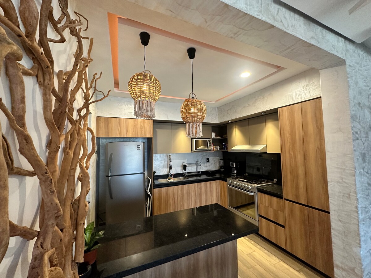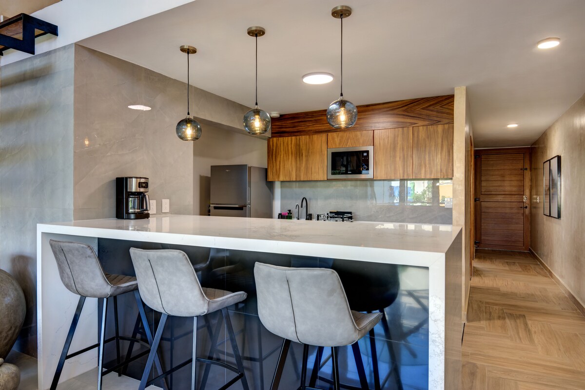 Disfruta este lugar en el paraíso, 120m2 de privacidad y de relajación, con una hermosa alberca privada ( solamente para ustedes ). Un departamento moderno y amplio, totalmente equipado a solamente un minuto caminando del mar. *A 1 minuto de la playa, caminando *Totalmente privado *1 cama king size *Estacionamiento *Cocina completamente equipada *Wi-fi ( muy buena velocidad para trabajar ) *A 10 minutos caminando de la quinta avenida *Terraza privada con su alberca privada *seguridad 24/24