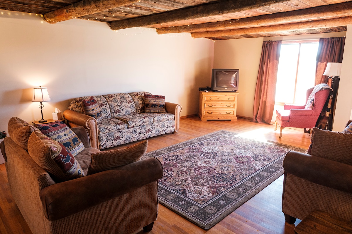 Situado en una ubicación tranquila en Kremmling, cerca de los servicios de la ciudad, es posible que olvides que estás en la ciudad. Este apartamento de 2 dormitorios y 1 baño cuenta con lavadora/secadora, televisión con paquete de satélite, reproductor de DVD y VHS, cocina completa/comedor/sala de estar y es un gran «campamento base» para todas las aventuras que ofrecen los condados de Grand, Summit y Routt. Cada uno de los dormitorios tiene una cama tamaño queen y la sala de estar tiene dos sofás cama tamaño queen plegables. No se permite fumar ni traer mascotas. Hay una gran zona de aparcamiento, ideal para remolques.
