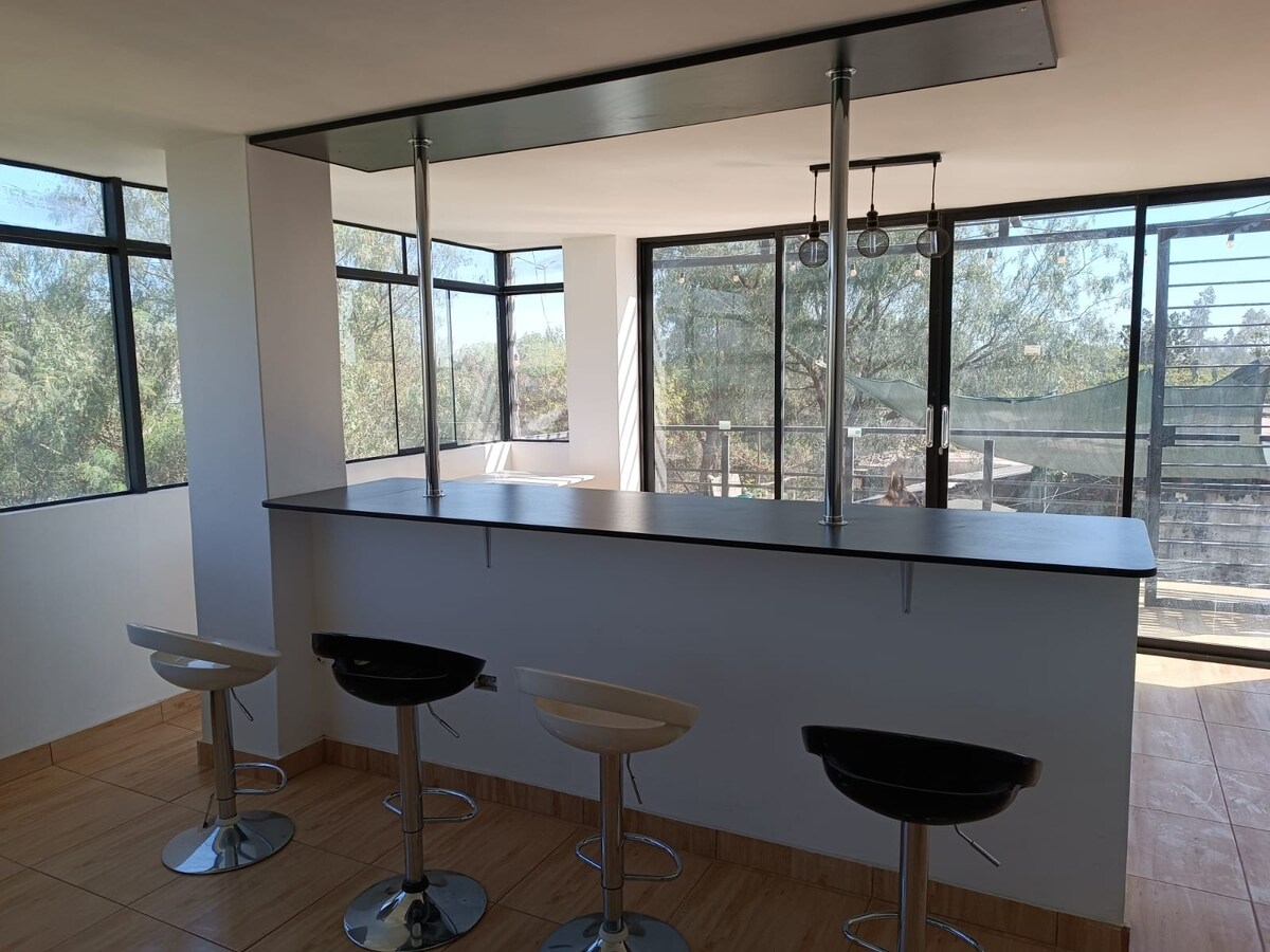 Relájate en este hermoso lugar! Estamos ubicados en una urbanización muy tranquila y segura. Tenemos un amplio jardín con piscina, arboles con sombra y zona de parrilla. Esta casa de huespedes está adjunta a nuestra casa, el espacio es privado y cuenta con su propio ingreso. La cocina será el único espacio de conexión con nuestro hogar y es de uso compartido. La casa de huespedes es amplia y muy iluminada, podrás disfrutar de hermosos atardeceres y vistas a los volcanes.