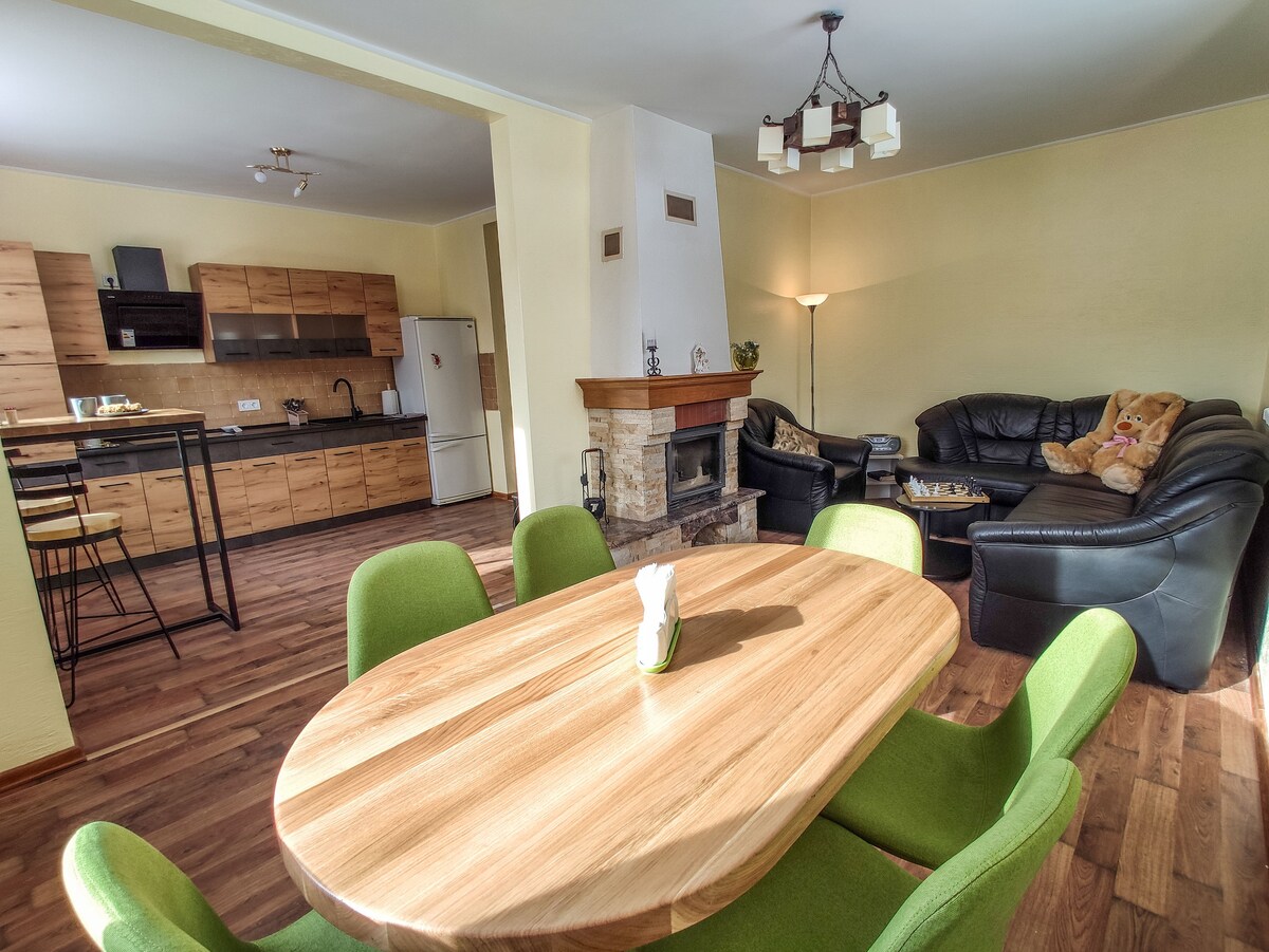 La finca "Acogedora" con vistas al bosque se encuentra en una colina cerca del centro recreativo "Magic Lakes" (500 m). Es un sitio fantástico para estar activo y pasivo. Ofrecemos relajación junto a la chimenea, donde podrás pasar un rato acogedor. Los muebles de la habitación y la cocina están hechos en estilo loft. La casa tiene capacidad para un máximo de 10 personas. La casa tiene 2 dormitorios, 2 baños, cocina-comedor. En el territorio de la casa hay un cenador, una parrilla con cocina, un columpio de 6 m de altura, ubicado en una colina. Hay una opción para pedir comida.