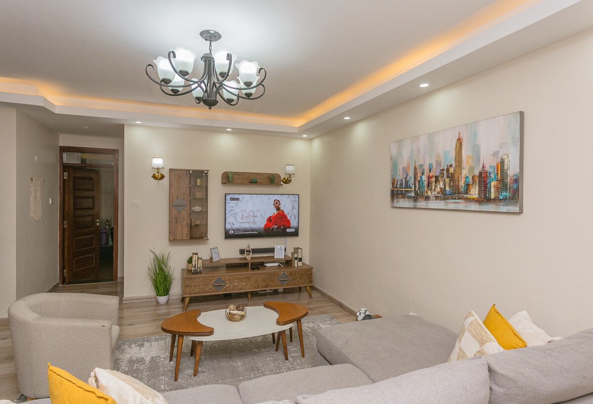 Disfrute de la vida moderna en este dormitorio de 1 dormitorio con un segundo dormitorio pequeño (estudio convertido), ideal para un máximo de 3 personas (2 compartiendo). Amueblado para mayor comodidad y conveniencia para estancias largas en Nairobi. 1. El dormitorio principal tiene una cama tamaño king y armarios empotrados. 2. El segundo dormitorio tiene una cama individual y un vestidor para guardar cosas. Internet de alta velocidad, Google TV de 50", lavadora, cocina americana completa, comedor, gimnasio. Generador de respaldo, estacionamiento gratuito. Cerca de Upperhill, hospitales coptos y KNH, embajadas, CBD y un campo de golf.