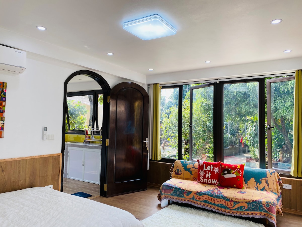 Diseñamos nuestro alegre bungalow inspirado en una casa tradicional Red Dao (nuestra tribu), con un marco de madera resistente, ladrillos rojos y maderas preciosas. Las aberturas de cristal bajo el techo mejoran la luz natural. Hay una encantadora entreplanta para colchones adicionales, perfecta para alojar a niños o amigos felices. Todos los muebles y la decoración están hechos a mano, y las cadenas de luces crean un ambiente acogedor y encantador. ¡Disfruta de tu propio baño privado justo al lado también! #EnjoyHappiness 😁😁😁