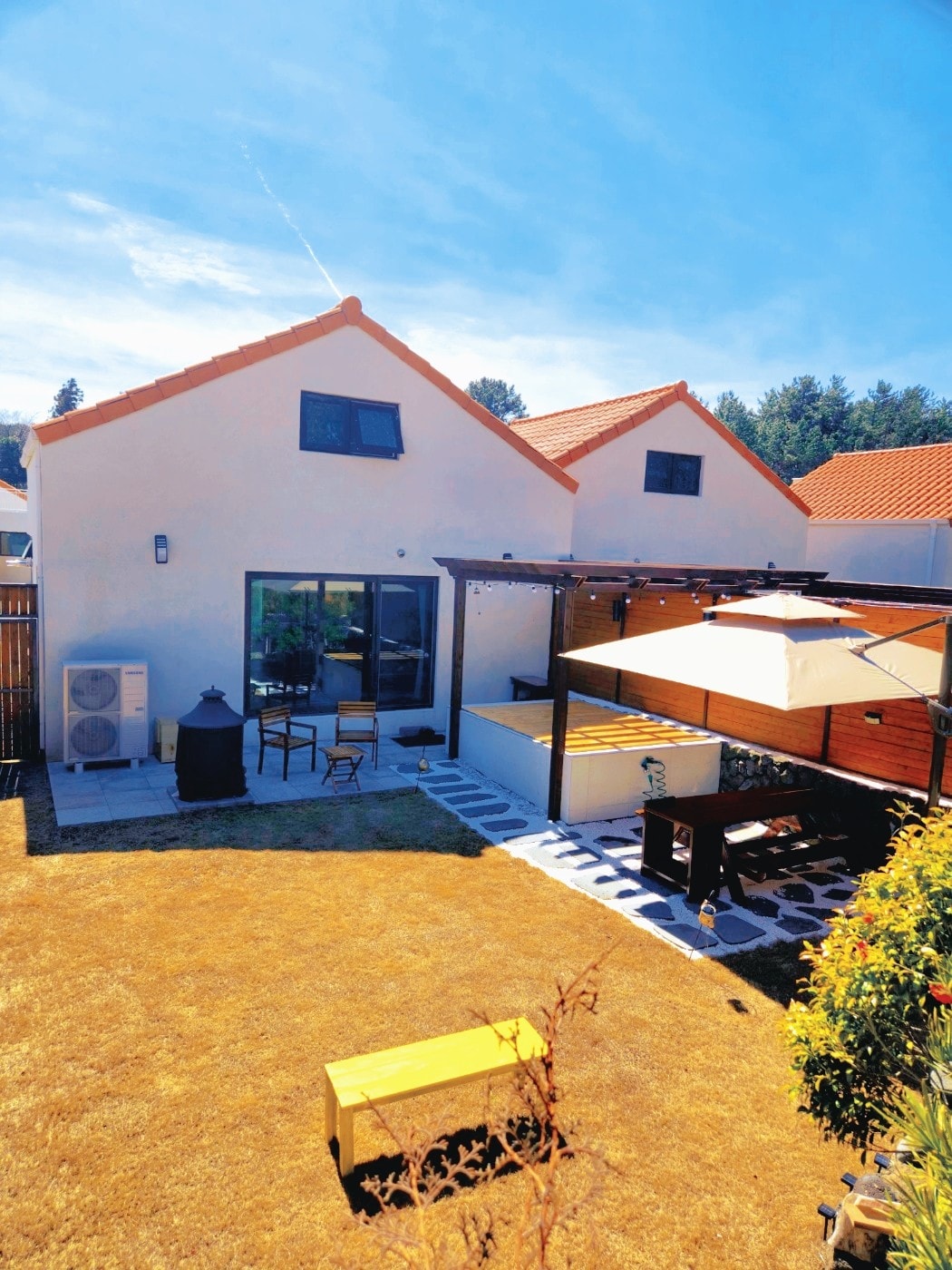 Se encuentra a menos de 10 minutos en coche del aeropuerto y cuenta con aparcamiento privado. A 5 minutos en coche se encuentra el E-Mart, Lotte Mart y Hanaro Mart, y aunque está ubicado en el centro de la ciudad, tiene la tranquilidad única de Jeju y está ubicado en un lugar alegre. Hay un patio con césped y se puede hacer barbacoa independientemente del clima. El primer piso tiene sala de estar, cocina, comedor y baño. El segundo piso tiene 3 dormitorios, 2 baños y un ático. Es un espacio amplio, agradable y cómodo de 60 pyeong.