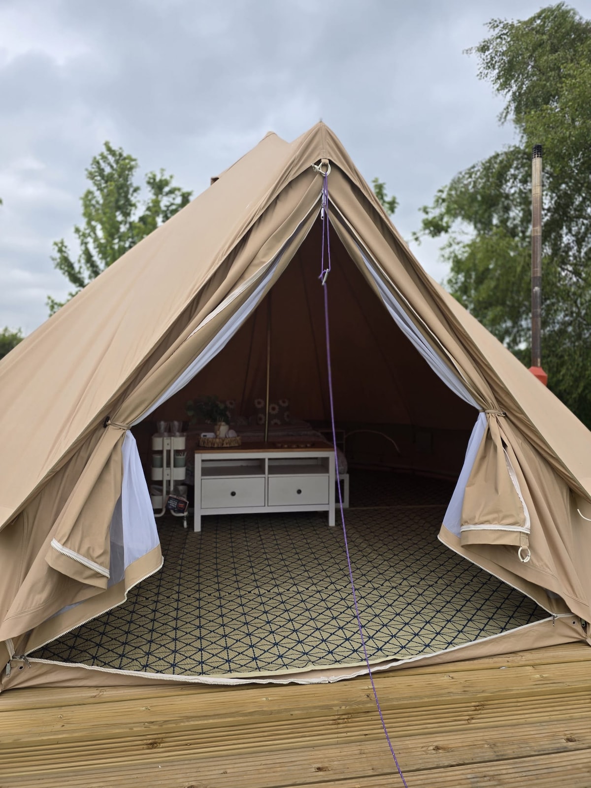 Daisy Lane Glamping ( York ) con estufa de leña. 5 tiendas de campaña Meta Bell. 1, cama real 4,6. 2, camas individuales para niños.(Por más de 2 adultos, se pagará un cargo adicional de 25 £ por adulto a la llegada) Hay cabras, pollos y el perrito Ted. Una encantadora zona de cocina de gas al aire libre bajo el cenador. Tu esquina privada, fogata, barbacoa, punto de carga del teléfono. Somos un sitio de glamping fuera de la red con inodoros de compost y hermosas duchas calientes. A 3 millas del centro de la ciudad de York en una gran ruta de autobús.