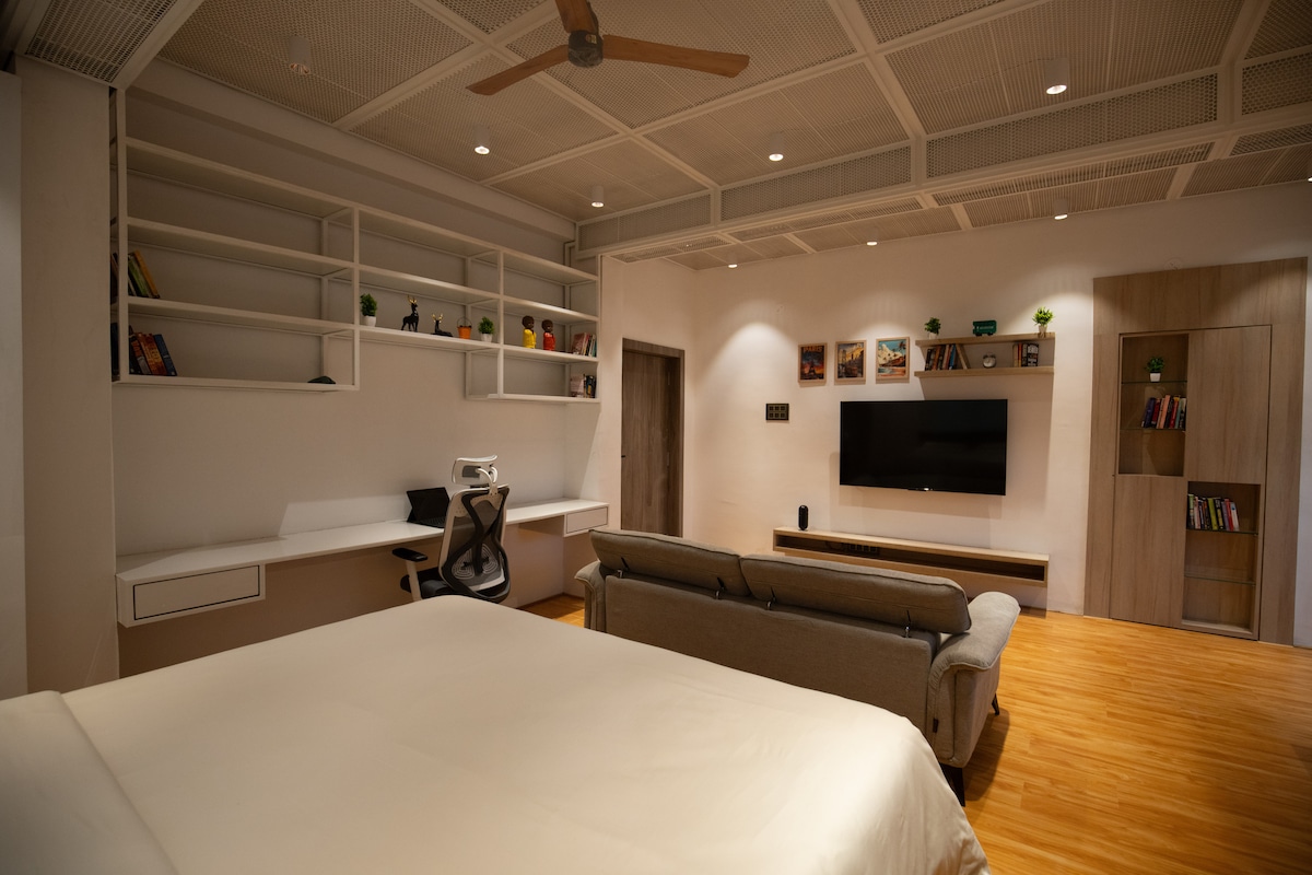 Welcome to Studio White, a modern 1BHK in a peaceful, green & very safe area. Perfect for couples and solo travellers. The home is 30–35 minutes from the airport with easy access to Uber, Ola and nearby food joints. All major food delivery apps work smoothly, and we’re happy to share our top recommendations. You’re 20–25 minutes from GVK Mall, 2 minutes from the nearest hospital, right next to a lovely park for morning or evening strolls. Self-check-in for complete convenience during your stay.