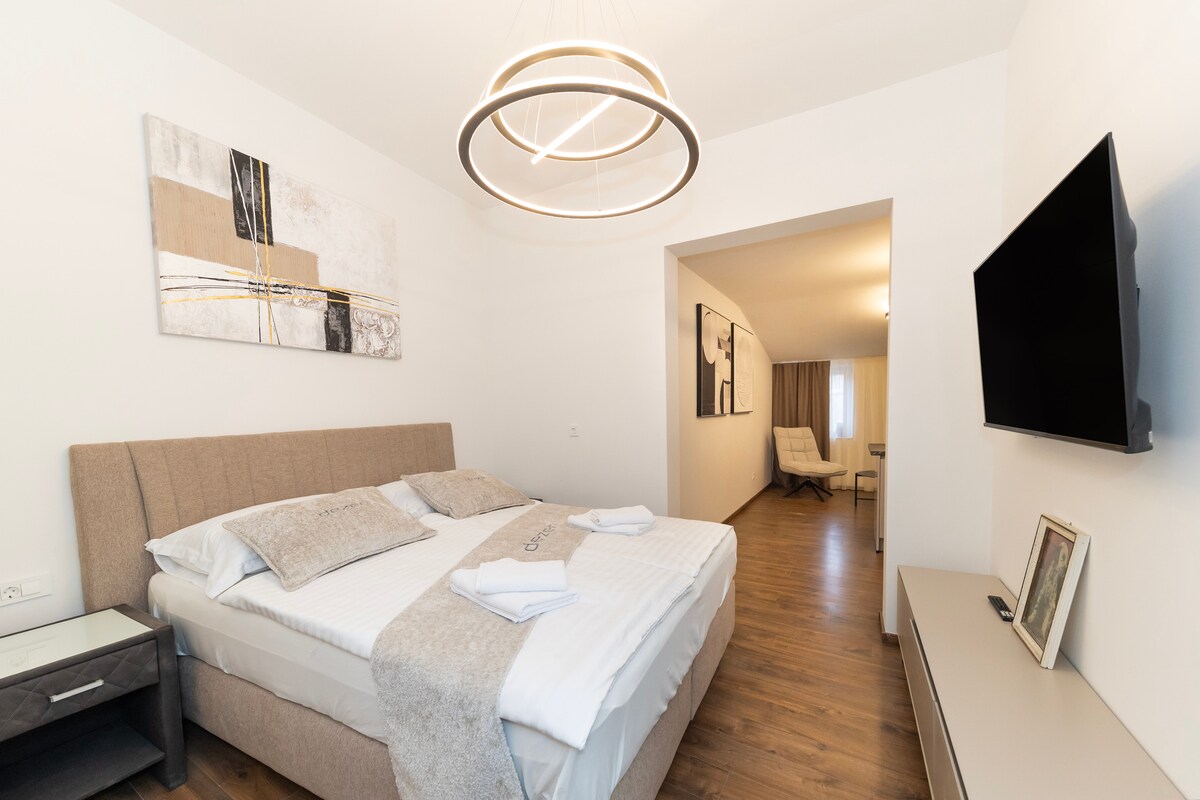 New building (2020), with private key card entrance, private parking garage for 2 cars. City center,50m from marina and sea, 5 minute walk to Kolovare beach, 7 minutes walk to old town. Designer decorated, with fiber optic star sky, interior led lighting and light ambience system. All rooms are equipped with automatic air-condition. Satellite Tv, Cable Tv, Youtube, Netflix in each room. Doorbell camera on the hallway of my apartment building.