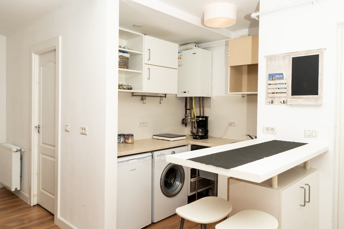 Welcome to your quiet retreat in the heart of Arad. This charming studio is part of Villa Veronica, a beautifully restored villa just steps from restaurants and attractions, yet tucked away in a peaceful courtyard. Enjoy your own private south-facing patio, perfect for relaxing. Bright and comfortable, the space includes a fully equipped kitchen, a spacious bathroom with bathtub, and thoughtful touches like coffee, tea, and small treats on the house.