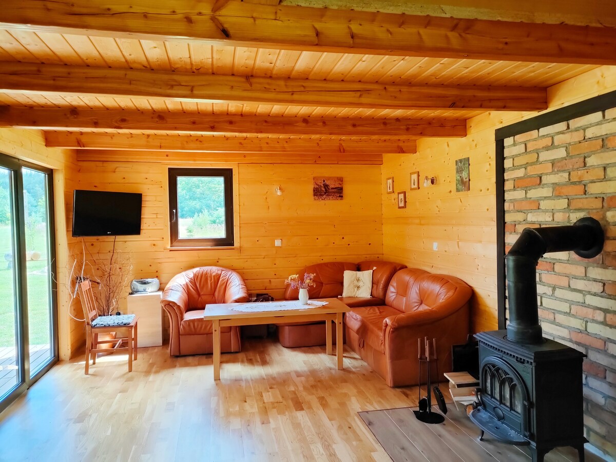 Casa de madera con un ambiente único junto al bosque. Hay un estanque con un puente justo al lado de la casa. Hay un barco y madera gratis para la chimenea y la hoguera. A una distancia de 10 km, una piscina con saunas, una playa gratuita, a 12 km de la casa se encuentra uno de los campos de golf más bonitos de Europa: Modry Las. Hay una segunda casa de campo de alquiler verde adyacente en la propiedad. Alquiler de toda la instalación bajo el nombre: «Casas de campo junto al estanque cerca del bosque - instalación exclusiva» por 590 PLN/noche