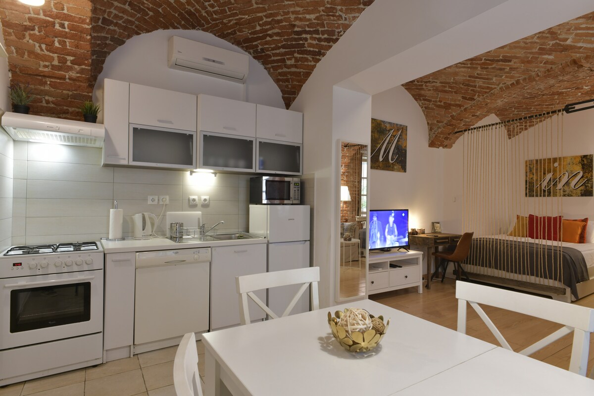 Apartment for relaxing and enjoying in the Zagreb city center, Tkalčićeva ulica, in pedestrian area full with restaurants, cafés and souvenir shops. Open space concept. Including wellness room: combo sauna (Finnish and Infrared), bathtub for two and big walk in shower. Queen size bed and yoga chair for relaxing. It's on the fourth floor in the building without elevator. For your discretion entrance is with the digital lock at any time You like. Full equipped kitchen with all necessary appliances
