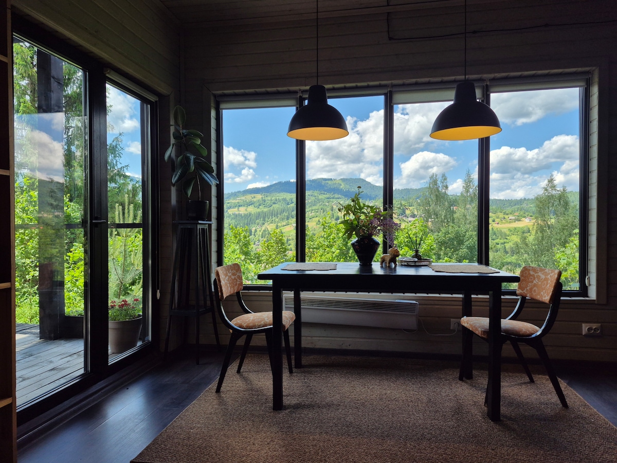 El chalet Borzhava es una casa moderna con vistas panorámicas a la cordillera de Borzhava. Es ideal para una escapada romántica para dos, para trabajar a distancia o para celebrar momentos especiales con los más cercanos. Independientemente del número de huéspedes, el chalet siempre está reservado en su totalidad. Nos encargamos de todos los detalles para tu comodidad, desde manteles para Instagram y ropa de cama blanca nítida hasta una colección de juegos de mesa y una biblioteca privada.