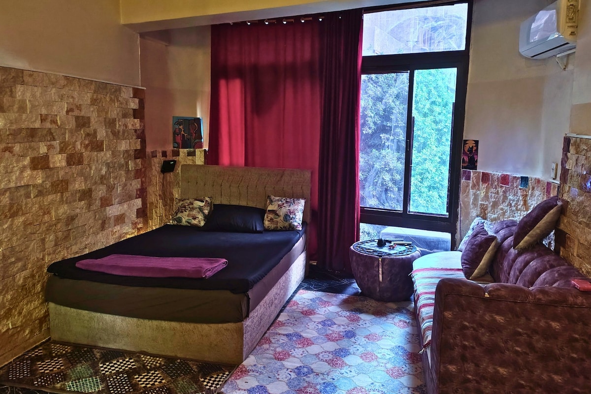 Este espacio único tiene su propio estilo. Bienvenido a un espacio no solo para dormir, sino para inspirarse. Este estudio está completamente diseñado con el cuidado de un artista, cada detalle en él está hecho con manos egipcias y un ojo que ama los detalles. Desde las paredes de piedra hechas a mano, hasta los toques de colores, hasta el cómodo sofá, y cada rincón tiene un espíritu.