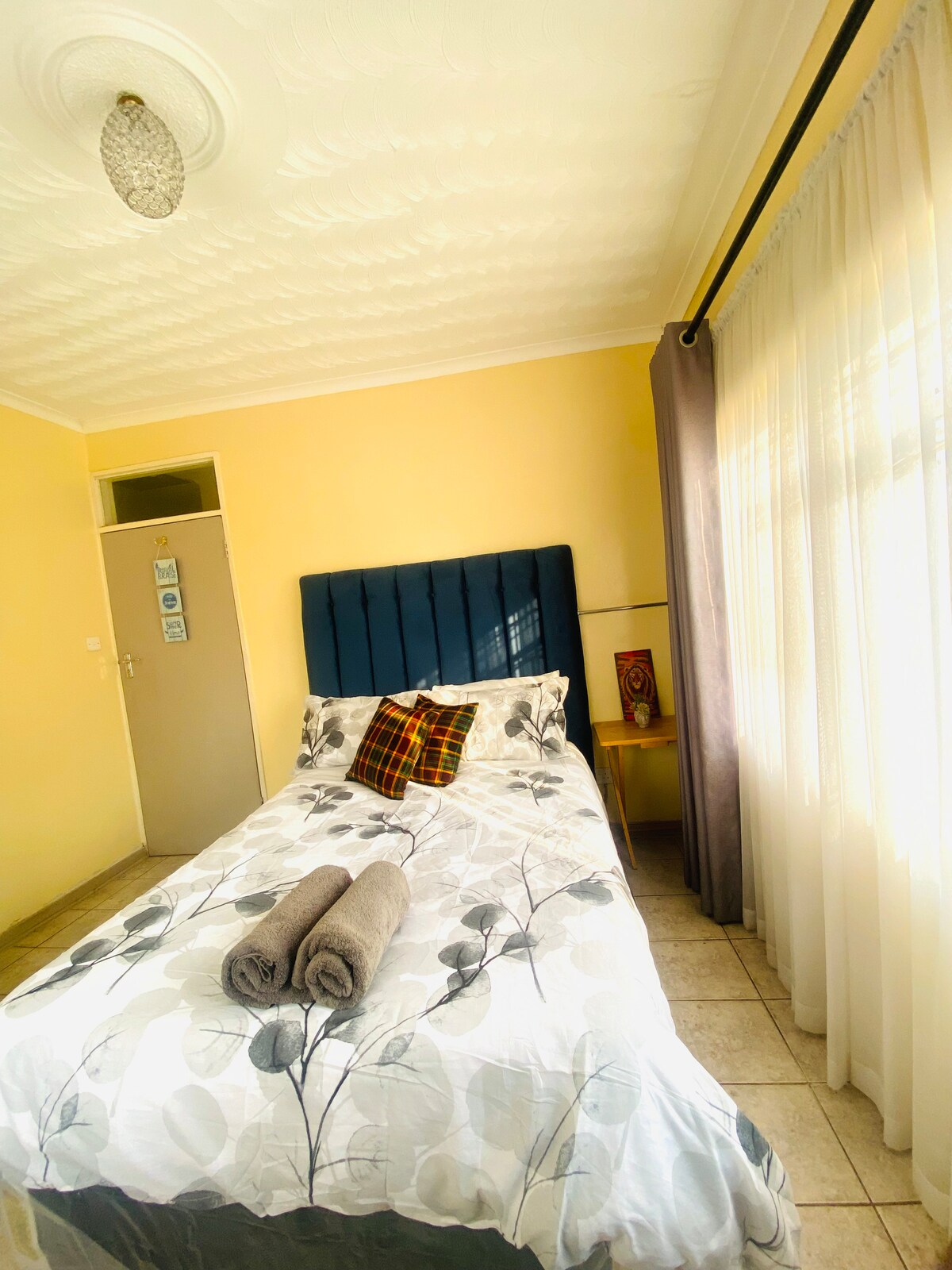 Una unidad independiente ordenada de 2 dormitorios con una cama doble y una cama de 3/4 en cada dormitorio, ducha combinada, salón de planta abierta y área de cocina. Agua caliente, sistema solar para respaldo, agua de pozo en las instalaciones. DStv(sin NETFLIX), wifi. Situado en el tranquilo suburbio de Greendale, a menos de 1 km de la zona comercial de Kamfinsa, a 2 km de la zona comercial de Highland Park.