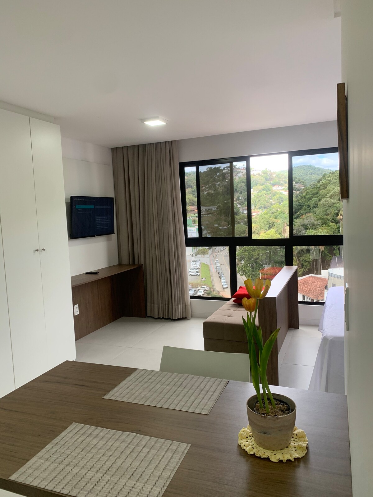 Sofisticado apartamento tipo estudio ubicado a 800 metros del parque Vila Germânica, lugar de eventos como el Oktoberfest. Rodeado de restaurantes, bares y supermercados. Todo para su comodidad: Smart TV 50" Samsung, aire acondicionado split, ducha de gas, wifi fibra 240mb, cocina completa con heladera Brastemp, microondas, horno, estufa, campana extractora, cafetera, purificador de agua, lava y seca, armarios, y por supuesto ¡una cama queen con el mejor colchón!