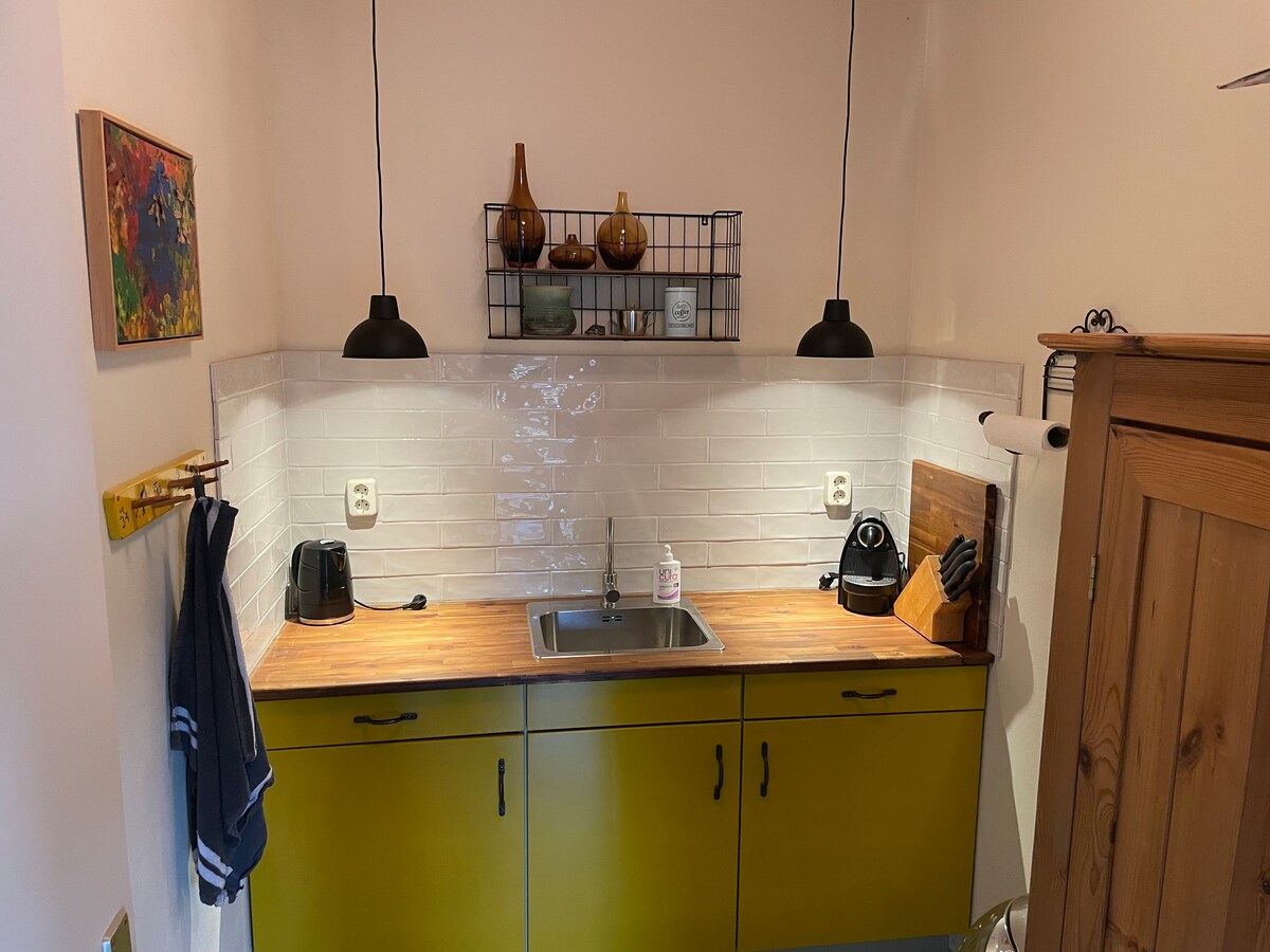 Naast het voormalige Wierde museum aan de Torenstraat in Ezinge staat het voormalig Groene Kruis gebouw. Wat vroeger het ‘consultatiebureau’ was, hebben wij omgebouwd tot een volwaardig appartement. Daar bieden wij een ruime woonkamer met veel licht, een slaapkamer met een comfortabel tweepersoons bed, een badkamer, een keuken, een toilet en een ‘eigen’ ingang. Let op: In principe geen ontbijt! (tenzij in overleg)
